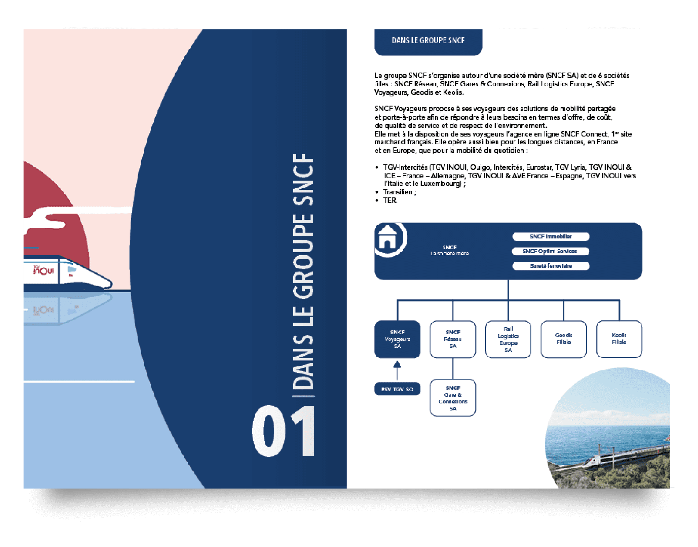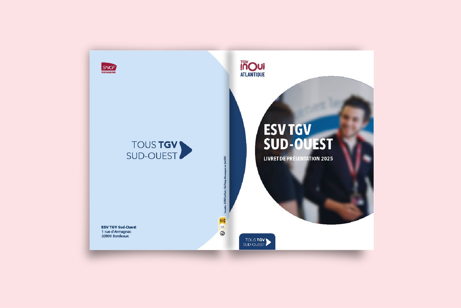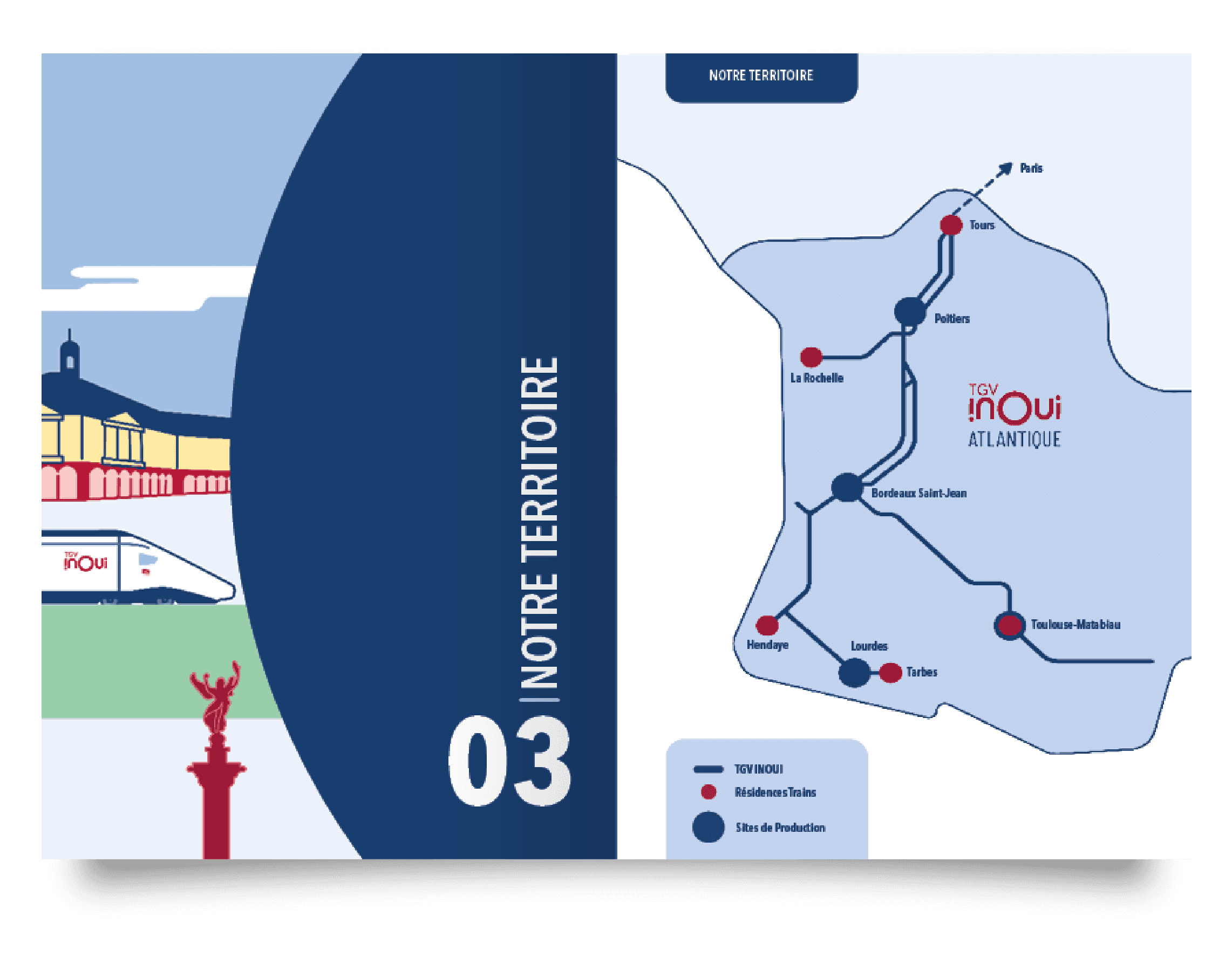 Durant mes deux années passées au sein de la SNCF, j’ai eu l’occasion, dès la première année, de réaliser une refonte complète d’un livret de présentation destiné à une partie de l’entreprise. Ce travail m’a été confié suite à l’arrivée de la nouvelle charte graphique TGV INOUI, qu’il fallait désormais appliquer.
