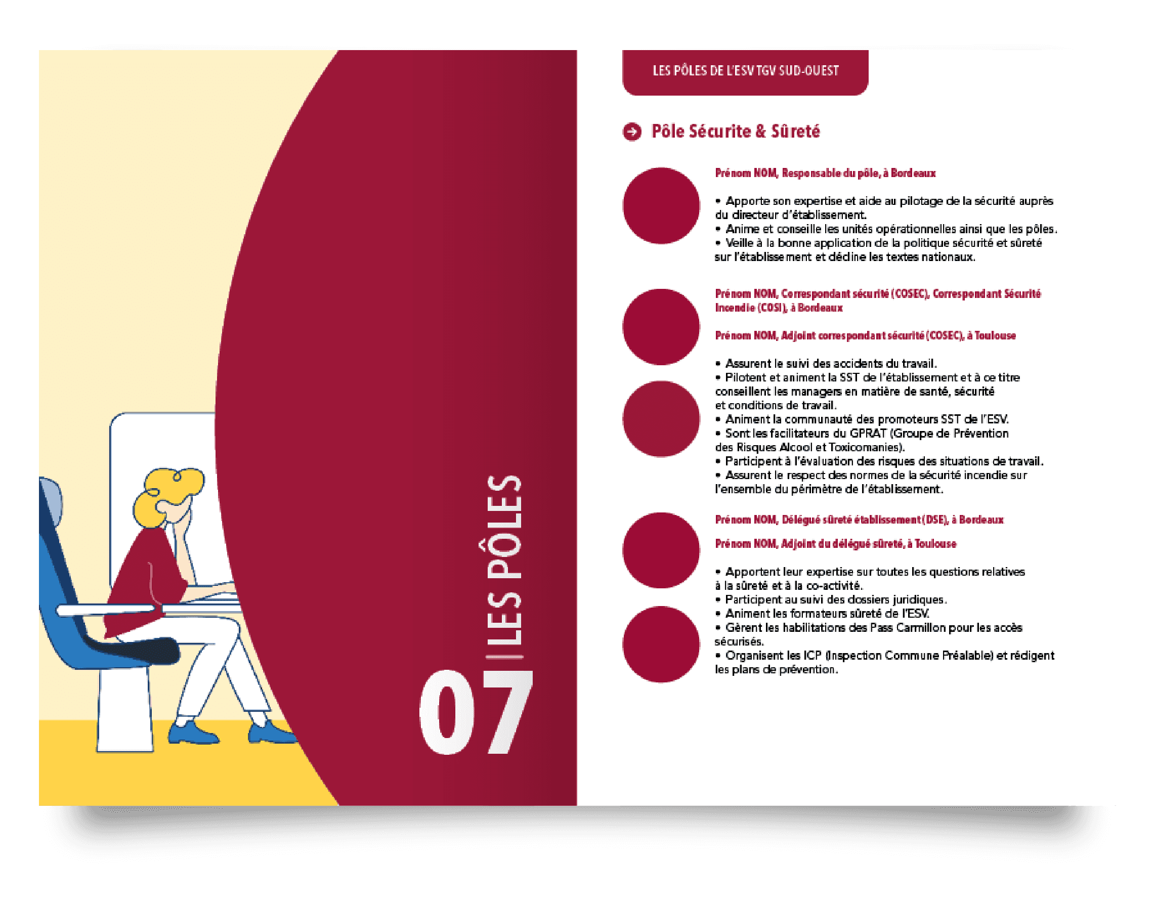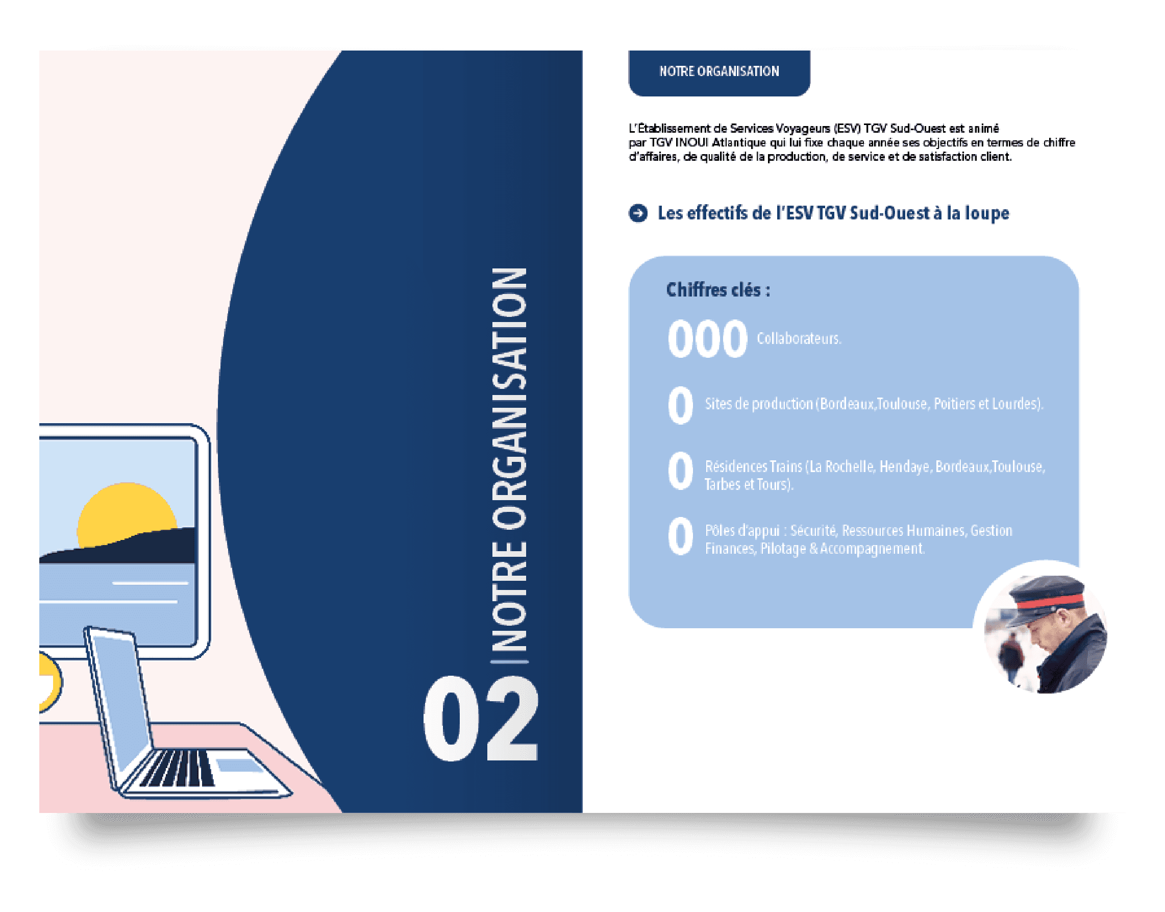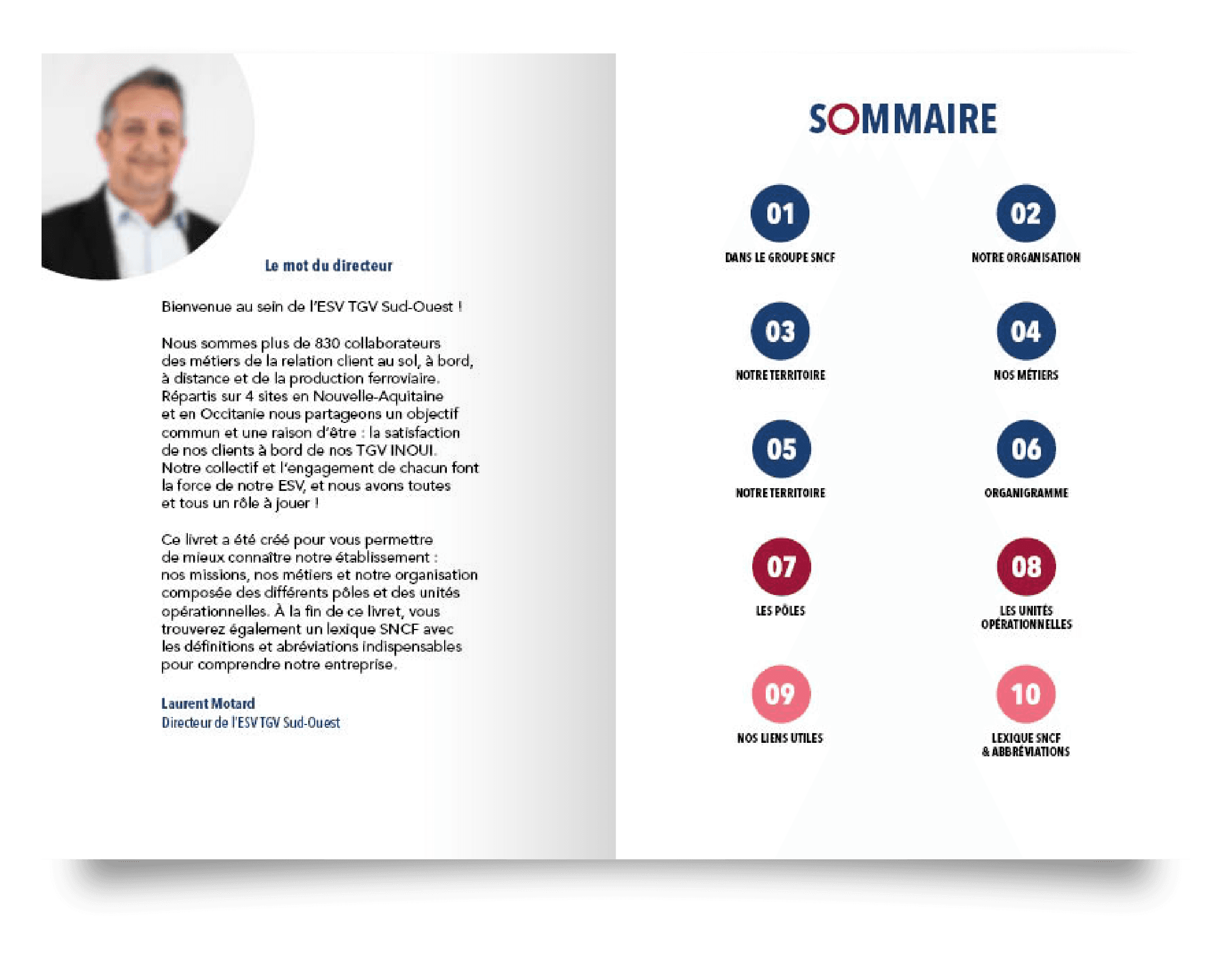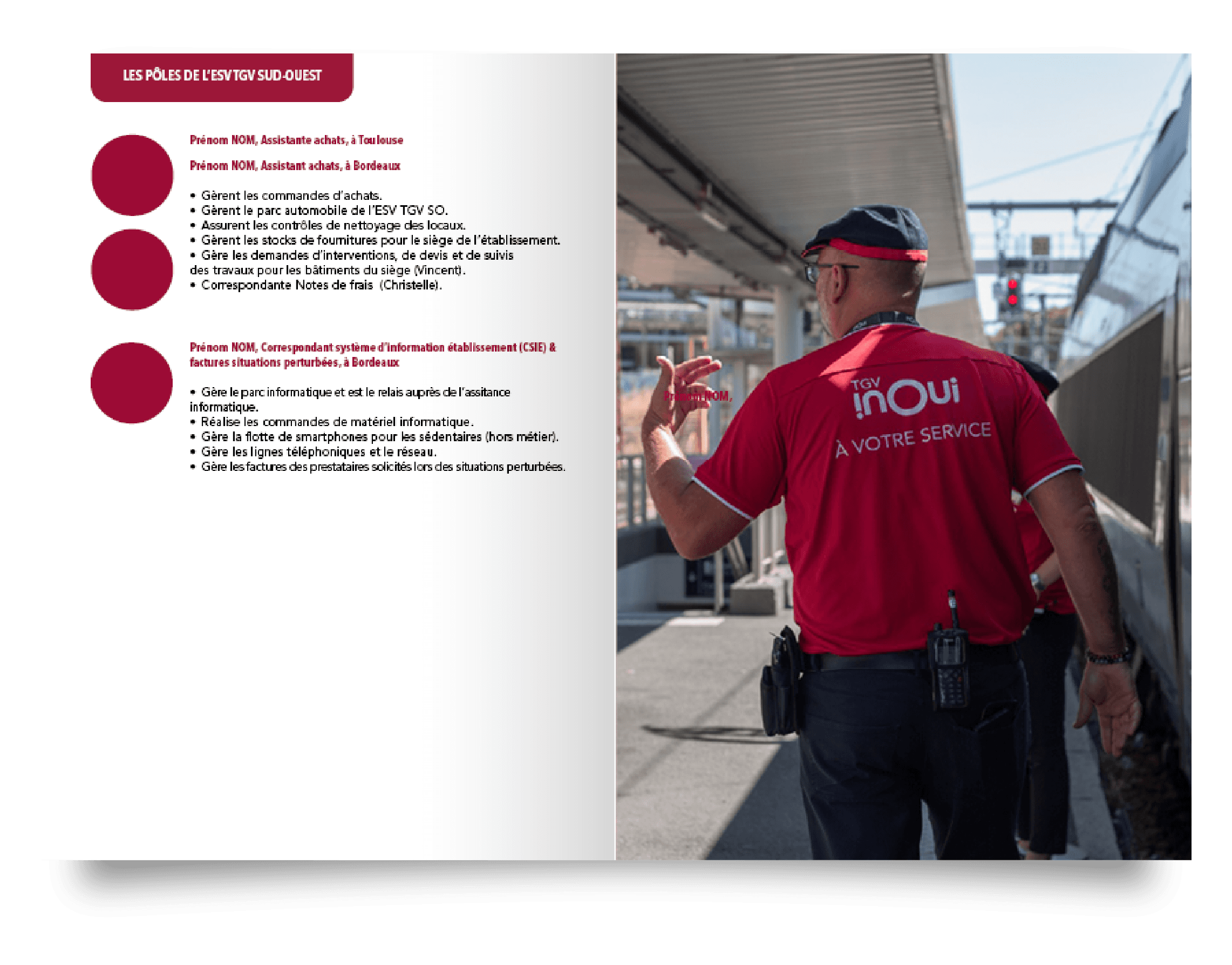 Durant mes deux années passées au sein de la SNCF, j’ai eu l’occasion, dès la première année, de réaliser une refonte complète d’un livret de présentation destiné à une partie de l’entreprise. Ce travail m’a été confié suite à l’arrivée de la nouvelle charte graphique TGV INOUI, qu’il fallait désormais appliquer.